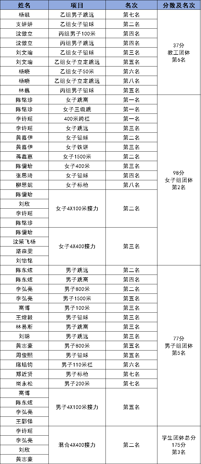 11月19日至21日,福建理工大学举行第三届田径运动会。我院11名教师、51名学生共62名师生参加此次比赛。在比赛中,运动员们发扬“爱体育,智人生”的精神,奋勇拼搏、团结协作,最终荣获教工组团体第六名、学生组团体总分第三名、学生女子组团体第二名、学生男子组团体第五名以及体育道德风尚奖的好成绩,女子组、男子组、学生团体总分及排名均取得突破。